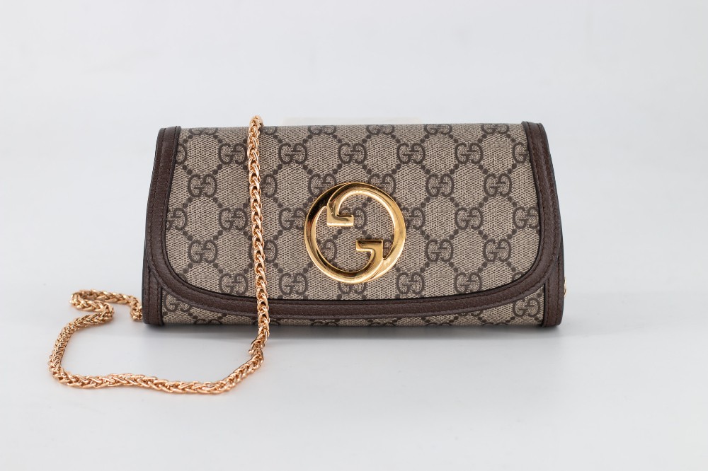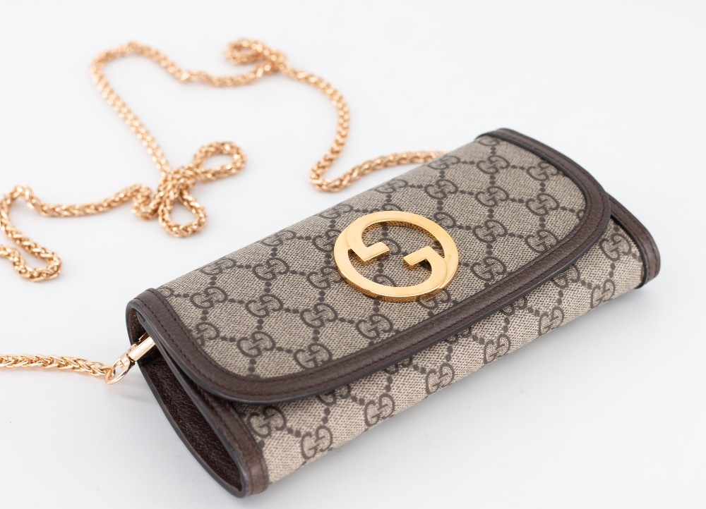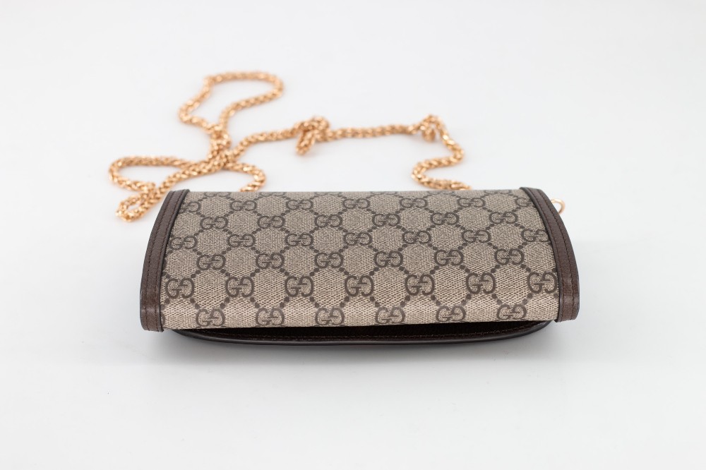 Gucci Wallet-on-Chain with removable chain to wear as crossbody or shoulder bag, or remove and carry as wallet or clutch. Classic Gucci monogram with gold GG hardware.
